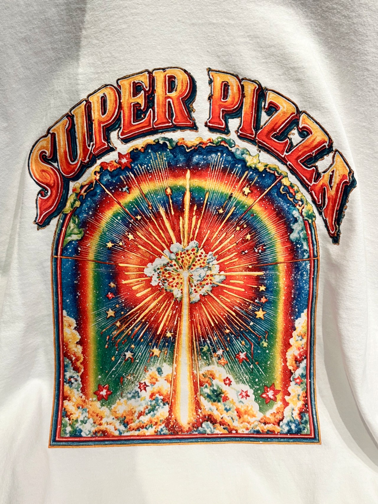 ピザへのインスピレーションが空から降ってくるその瞬間を、サイケデリックに描いたグラフィックTシャツ。ピザのスライスがまるで神の使いのように降臨し、爆発的なアイデアと味覚の世界を開く扉を表現しています。